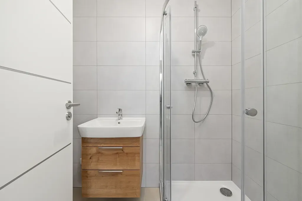Příslušenství bytu je 1x koupelna s vanou a WC, 1x koupelna se sprchovým koutem,