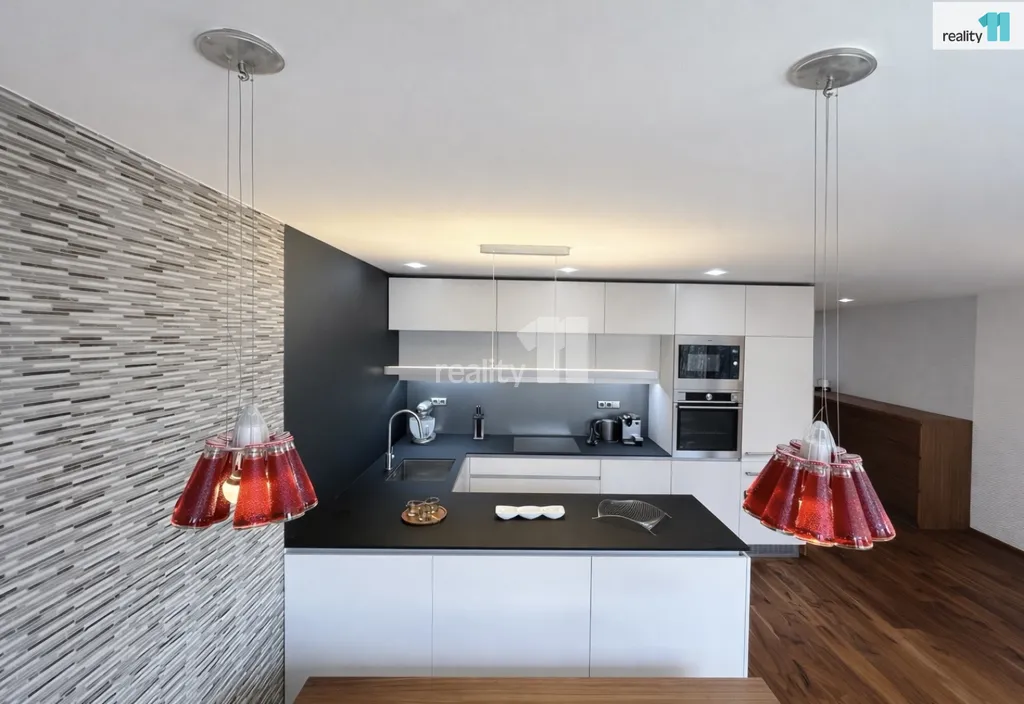 Dominantou bytu je prostorný obývací pokoj s kuchyňským koutem a jídelní částí. Moderní kuchyňská linka v matném provedení je vyrobena na míru a vybavena kvalitními spotřebiči značky AEG. Celý interiér sjednocuje dřevěná podlaha z amerického ořechu, která dodává prostoru teplý a elegantní charakter.