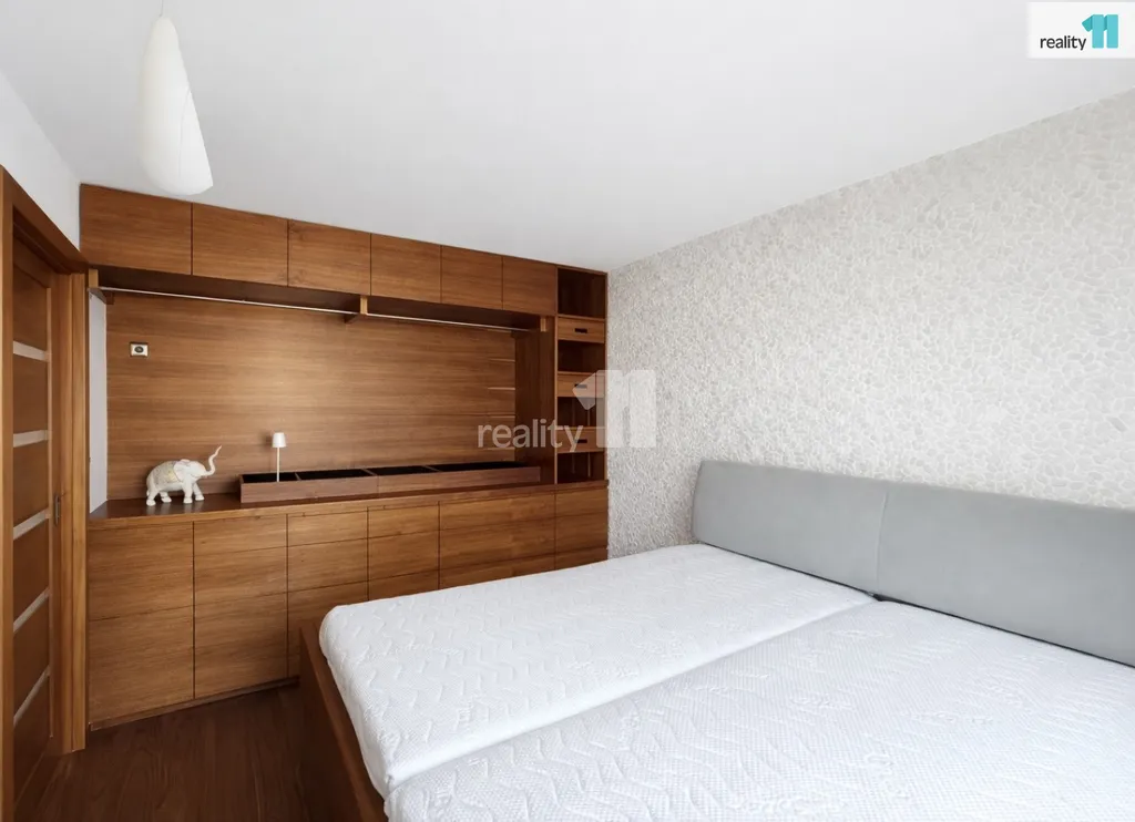 V celém bytě je dostatek úložných prostor díky vestavěnému nábytku na míru a praktické řešení dispozice včetně posuvných interiérových dveří.