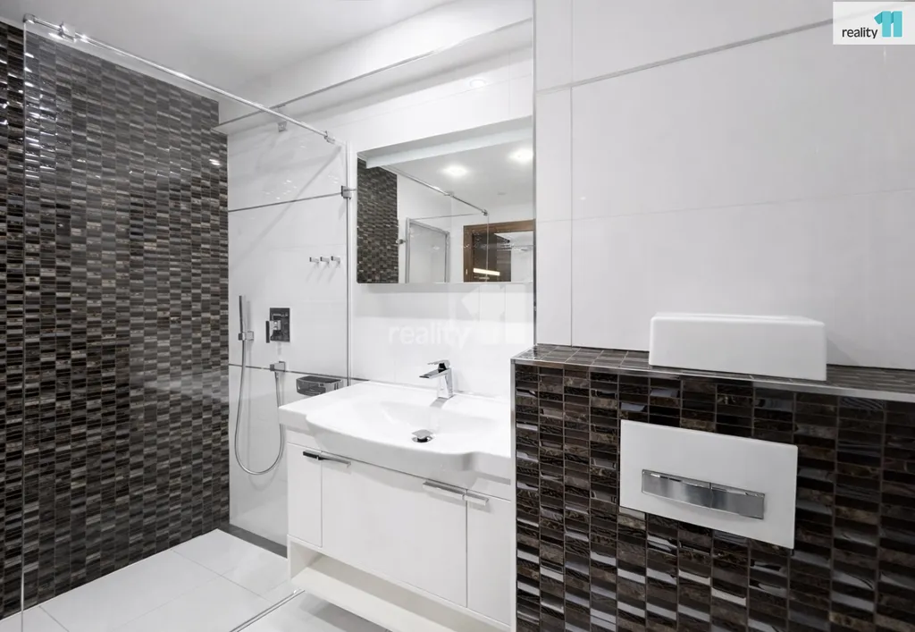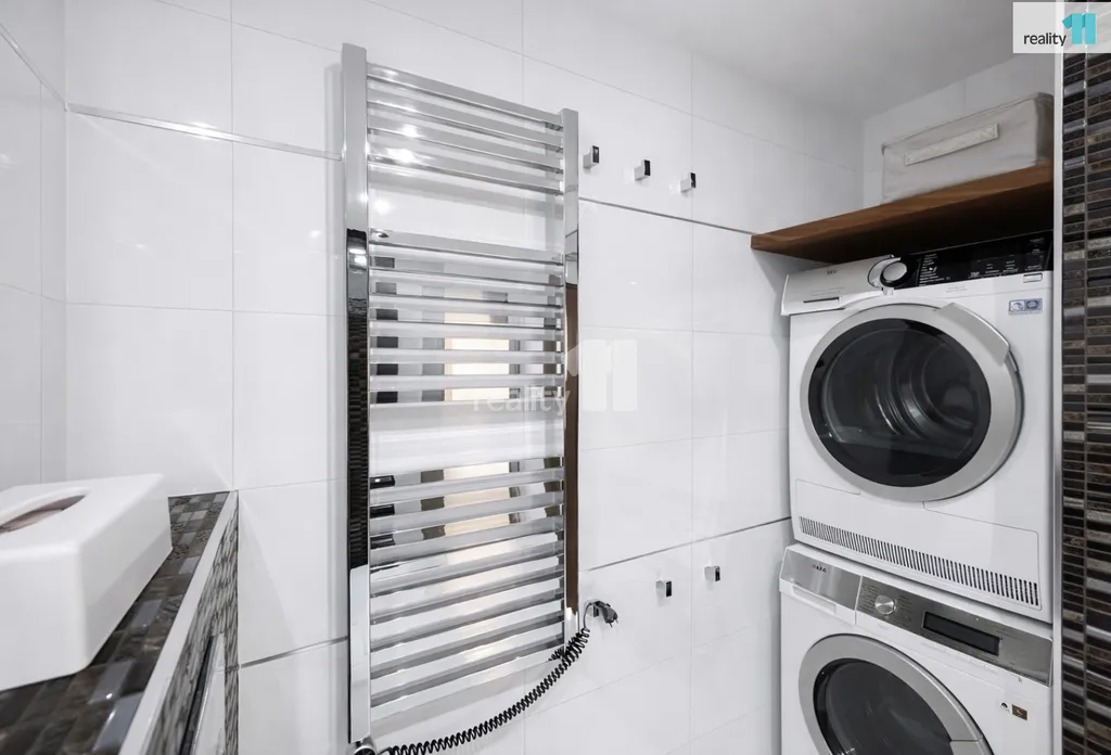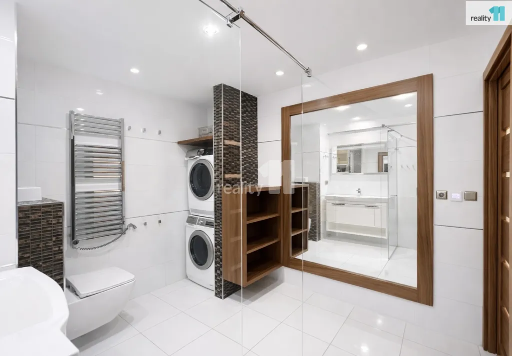 Koupelna je také provedena ve vysokém standardu – vybavena sanitou Villeroy & Boch, bateriemi Grohe, sprchovým koutem, podlahovým vytápěním a nerezovým žebříkem. Součástí je i pračka a sušička.
