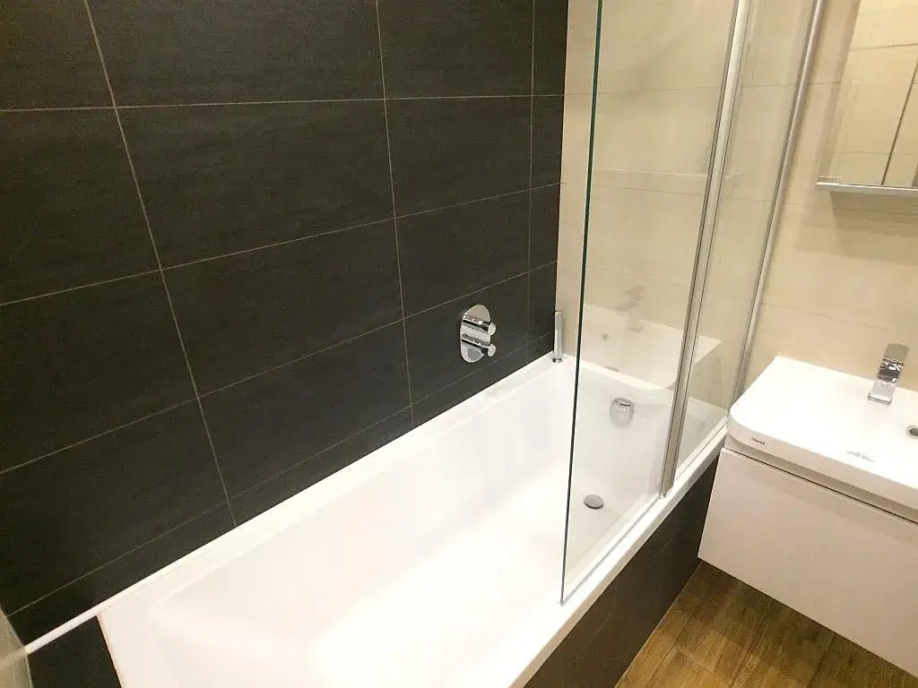 Byt je částečně zařízen plně vybavenou starší kuchyní včetně elektrické varné desky, digestoře, elektrické trouby, myčky, ledničky. WC a koupelna moderně zařízené, wc s bidetovou sprškou, koupelna s prostornou vanou, opatřenou zástěnou, trojcestnou podomítkovou termostatickou baterií s napouštěním vany přepadem, ruční i hlavovou sprchou, ideální jak pro koupání, tak pro pohodlné sprchování. Zajímavá interiérová světla s možností volby zabarvení světla pomocí dálkového ovladače, nebo mobilní aplikace.