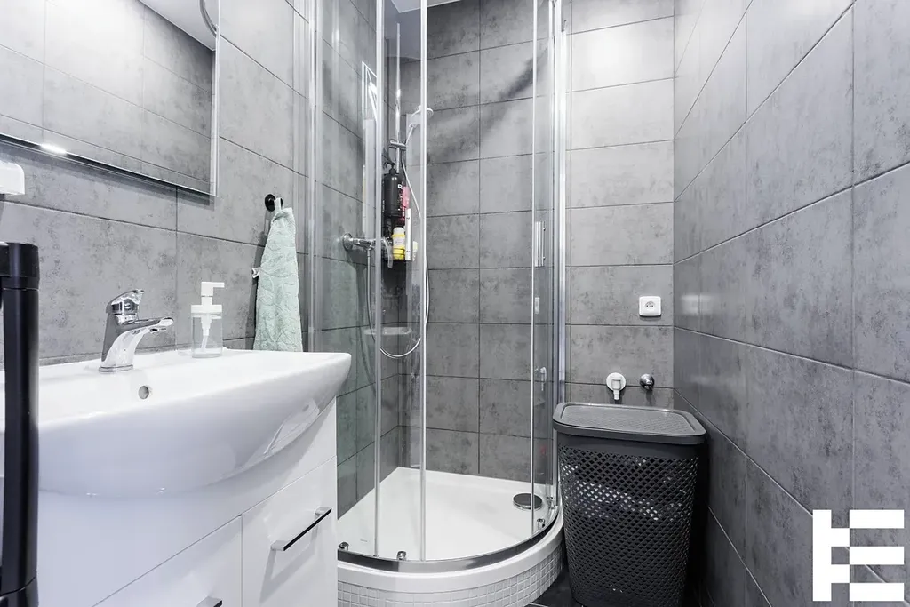 Koupelna se sprchovým koutem a prostorem pro umístění pračky.