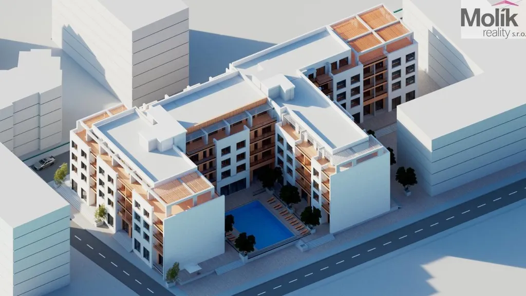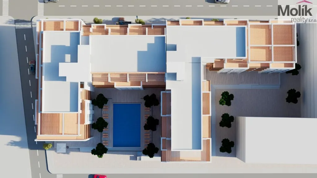 Apartmán je situován v budově s uzavřeným vnitroblokem, což zajišťuje obyvatelům maximální soukromí a klid. Dominantou celého komplexu je velkorysý venkovní bazén, kolem kterého se soustředí veškerý společenský život.