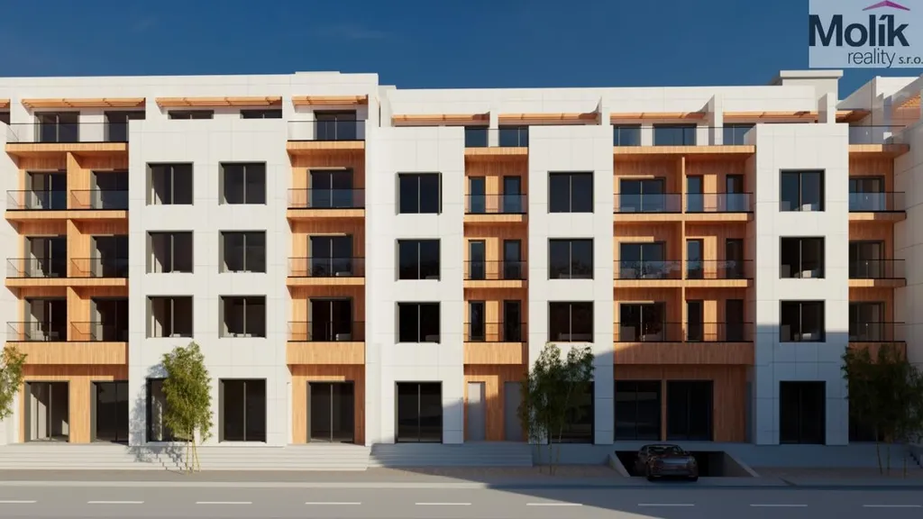 Design a kvalita: Fasáda kombinuje moderní hliníkové prvky, skleněná zábradlí na balkonech a dřevěné obklady, které dodávají stavbě luxusní vzhled.