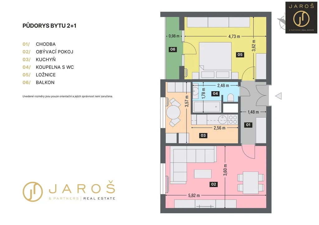 Byt se skládá ze vstupní chodby, kuchyně s jídelním stolem, koupelny s vanou a wc, obývacího pokoje 21m2 a ložnice 17 m2 s vstupem na lodžii 3,5 m2. Ložnice, kuchyně i obývací pokoj mají velká jihovýchodně orinetovaná okna zajišťující prosluněnost celého bytu.