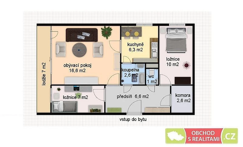 Výměra bytové jednotky je 52,46 m² + sklepní kóje 0,9 m² + lodžie 6,96 m². Byt je v původní stavu, dispozici bytu nelimitují stěnové panely, neboť dispozice uvnitř bytu je tvořena nenosnými deskami a umakartovým jádrem. Stávající dispozici bytu přikládáme. Byt se nachází v nejvyšším 8. podlaží (sedmém patře).