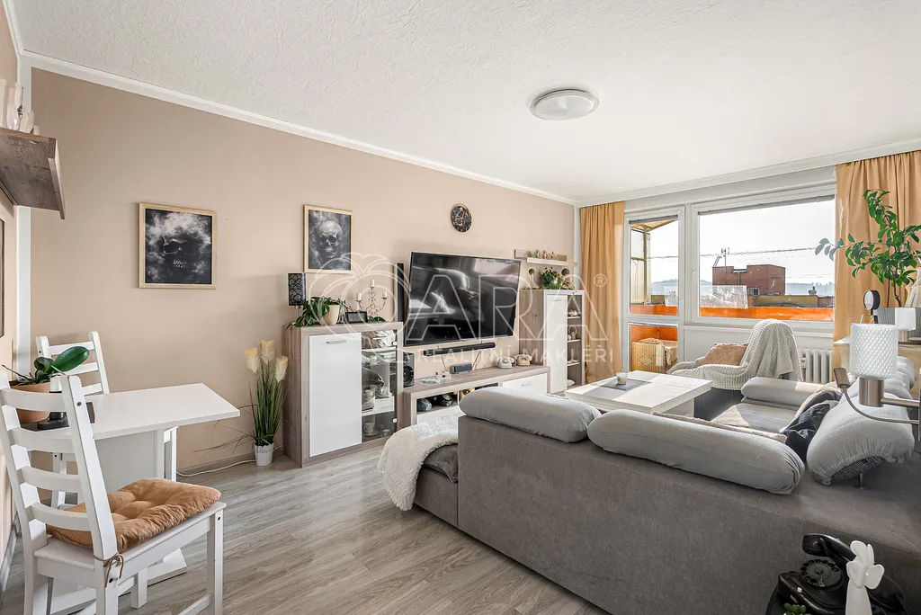 Dominantou bytu je prostorný obývací pokoj, který působí vzdušně a přirozeně propojuje místo pro odpočinek i setkávání s rodinou či přáteli. Na něj navazují dva samostatné pokoje, které lze využít jako ložnici, dětský pokoj nebo pracovnu. Kuchyně je řešena prakticky a nabízí dostatek místa i pro jídelní kout, takže každodenní fungování je pohodlné a bez kompromisů.
