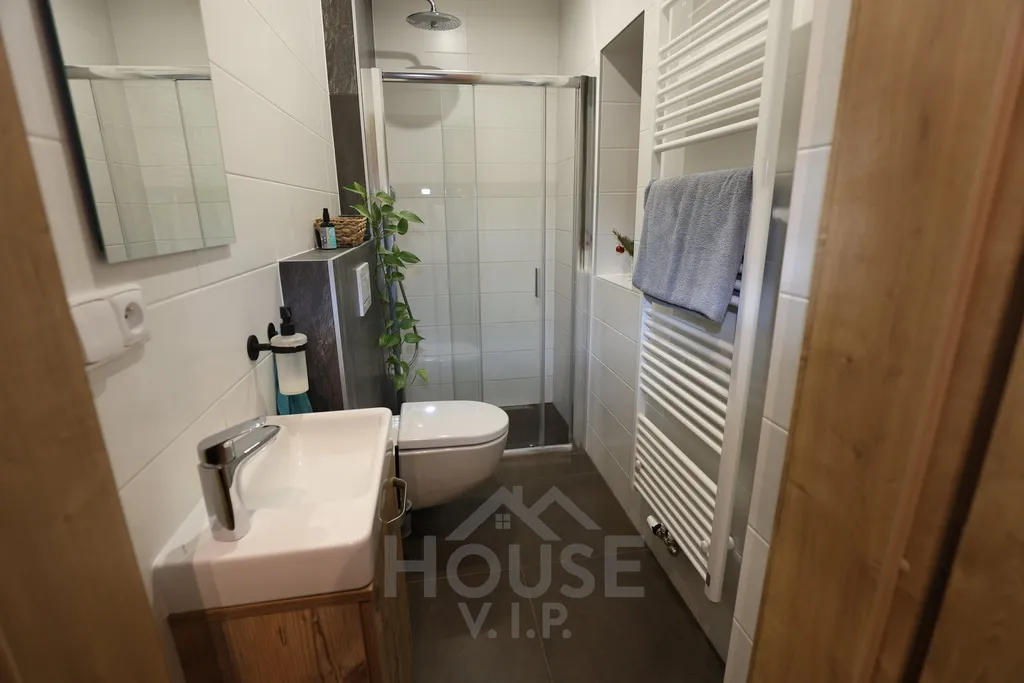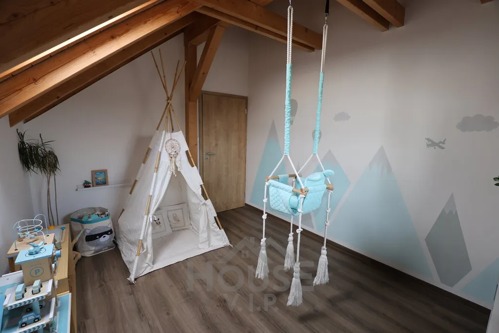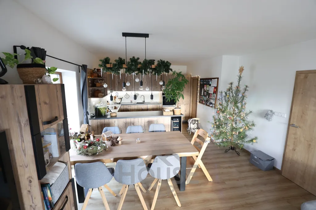 Interiér domu je laděn do teplých přírodních odstínů dřeva a působí velmi útulně. Většina nábytku byla vyrobena truhlářem na míru a je součástí prodejní ceny. Užitná plocha domu činí přibližně 132 m², dispozice je 6+kk. Dům je energeticky úsporný (PENB třídy B) s nízkými provozními náklady a je vybaven zabezpečovacím systémem Jablotron.