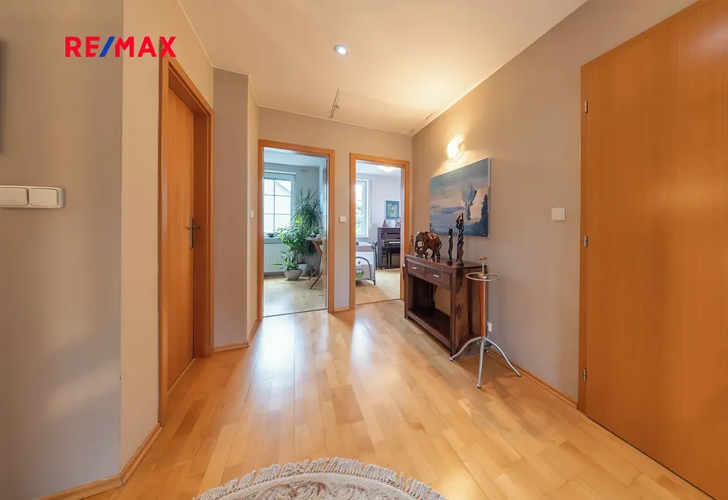 Dominantou přízemí je prostorný obývací pokoj propojený s jídelnou, pracovnou a kuchyní, který tvoří přirozené centrum domu. Kuchyň je vybavena kvalitní italskou kuchyňskou sestavou CESAR se zánovními spotřebiči. Interiér doplňují designová italská svítidla, dřevěné podlahy a poctivé na zakázku vyrobené masivní schodiště, které potěší každého milovníka kvalitního truhlářského řemesla.