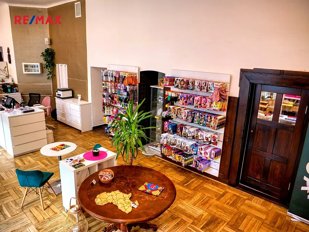 Dále je k dispozici oddělená místnost vhodná jako salon nebo kancelář a zázemí (2x sociální zařízení) včetně skladu.