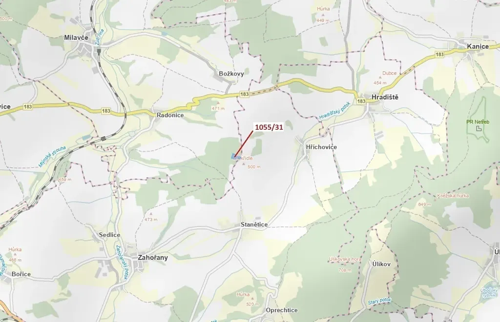 Lesní pozemek o výměře 9 168 m2, parcelní číslo 1055/31, podíl 1/1, katastrální území Radonice u Milavčí, obec Milavče, obec s rozšířenou působností Domažlice, okres Domažlice, Plzeňský kraj.