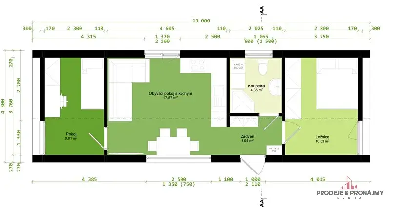 obývák s kuchyňským koutem 17,57 m2, ložnice 10,53 m2, dětský pokoj 8,81 m2, koupelna a WC 4,35 m2, zádveří 3,04 m2.