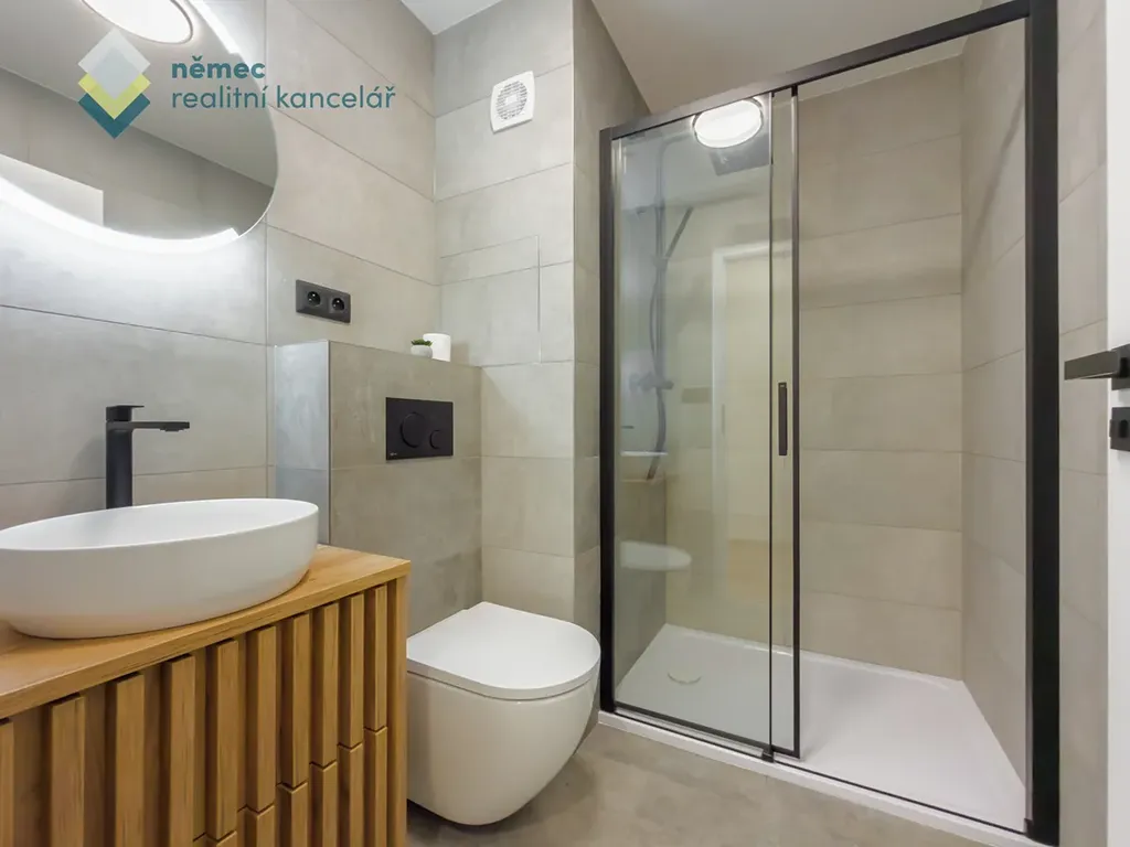 Koupelna je v decentní kombinaci šedé, černé, bílé a dřeva. Oceníte široký walk-in sprchový kout, závěsné wc, designové topidlo, odvětrávání a zrcadlo s led osvětlením.