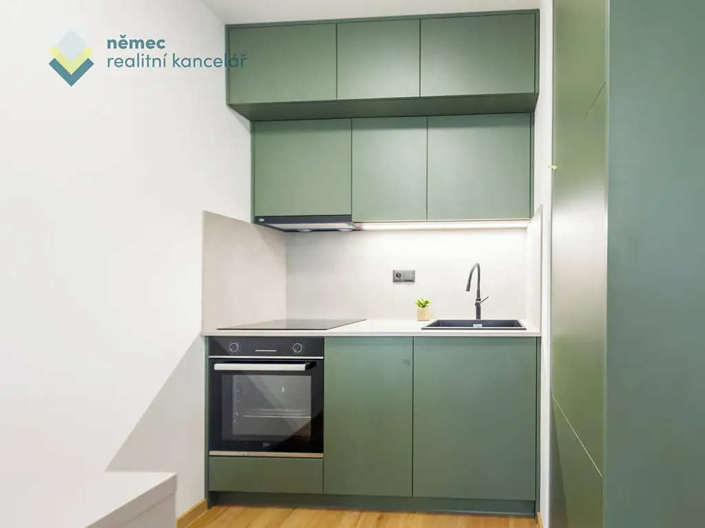 Jsou byty a byty. Troufáme si říct, že tohle je TEN byt. Minimalistický design lahodící oku - na podlaze je rigidní vinylová podlaha v dekoru Oak, kvalitní kuchyň na míru s barem od profesionálního truhlářského studia Truhlárna74 barevně kombinuje kouřově zelenou s tenkou pracovní deskou v dekoru kamene Calcit oblázkově šedém. K tomu všemu černé doplňky, vestavné spotřebiče (hork. trouba, odsavač par, indukční varná deska, větší kombinovaná lednice s mrazákem, myčka) a černý granitový dřez s baterií. Oceníte dvě řady horních skřínek a LED osvětlení, nebo třeba zásuvku (vč. USB) v pracovní desce baru. Na fotkách chybí černé úchytky Nakana spodních skřínek (budou doplněny po uveřejnění nabídky).