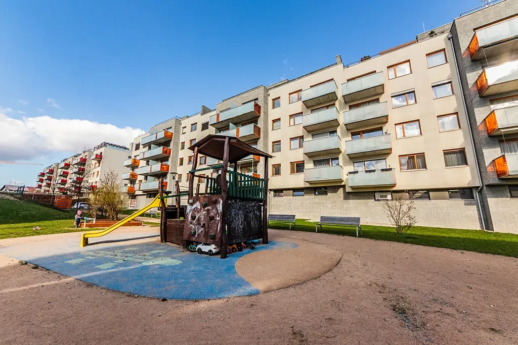 Slunný, jihozápadně orientovaný 3+kk s užitnou plochou 69m2, balkonem a výhledem do soukromého a bezpečného vnitrobloku s posezením a dětským hřištěm.
