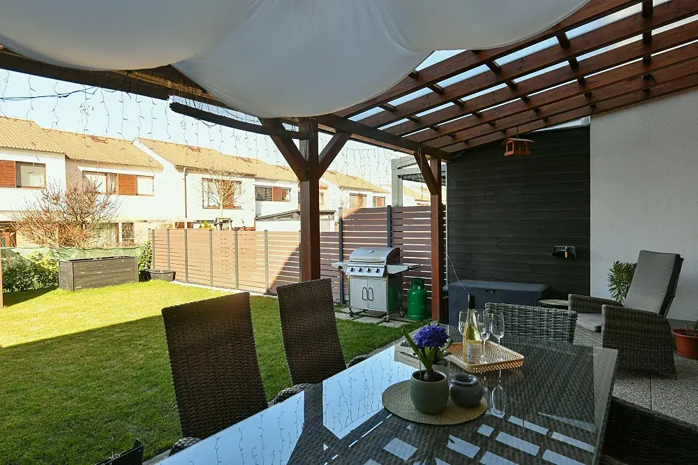 Příjemná dispozice rodinného domu 4+kk nabízí novému majiteli prostornou vstupní chodbu, se samostatnou toaletou, technickou místností a skladem, dále pak obývací pokoj s prakticky oddělenou kuchyní. Z obývacího pokoje je vstup na terasu, kterou chrání na zakázku instalovaná dřevěná pergola a tím je zajištěno klidné posezení i při nepříznivém počasí. Z terasy je možné dále pokračovat na zahradu s vyvýšeným záhonem a zahradním domkem. Ve 2. NP jsou 3 ložnice, šatna a koupelna se sprchovým koutem, vanou, toaletou a dvěma umyvadly. Jako skladovací prostor je možné využít i pochozí půdu domu.