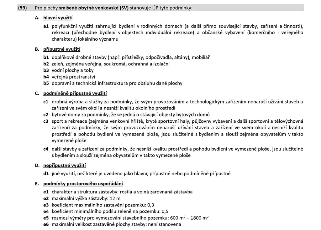 • Hlavní využití: Rodinné domy, stavby pro rodinnou rekreaci i občanské vybavení lokálního významu.