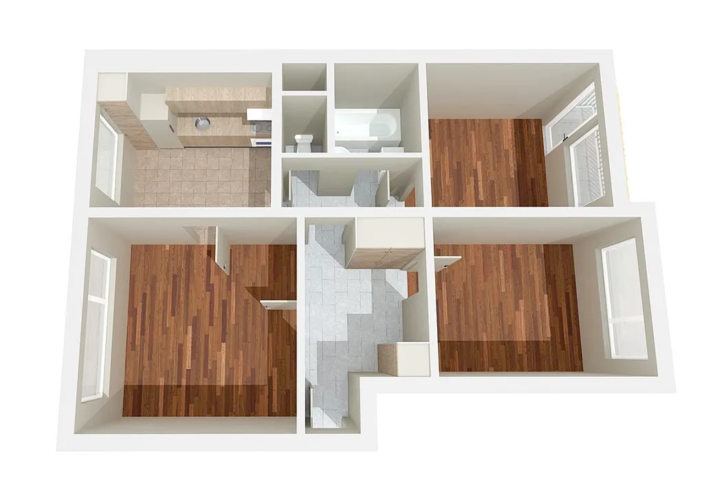 • Dispozice a prostor: Tři samostatné pokoje. Obývací pokoj je propojen s kuchyní, přičemž příčku lze vybourat a vytvořit moderní otevřený prostor.