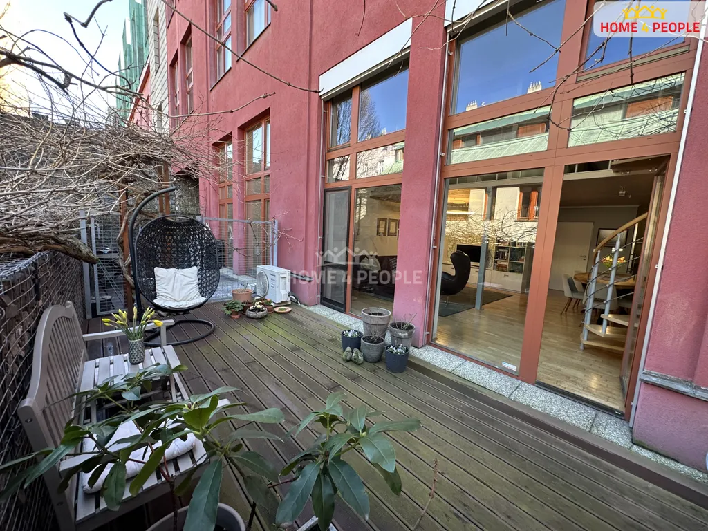 Zprostředkujeme Vám pronájem atraktivního mezonetového bytu 3+KK s terasou, který se nachází v Praze 8, část Libeň, v ulici Novákových v oceňovaném projektu Lofty Palmovka. Byt se nachází v přízemí domu a disponuje plochou 97 m² s terasou 23 m² a je rozložen do dvou úrovní, což poskytuje dostatek soukromí a prostoru pro celou rodinu. Součástí spodní části je vstupní chodba s botníkem, koupelna se sprchovým koutem, dvojumyvadlem a toaletou. Z chodby je přístup do komory (3 m²) s dostatkem úložného prostoru. V komoře je přípojka na pračku a sušičku. Dominantou bytu je prostorný obývací pokoj s prosklenou stěnou se 2 vstupy na terasu. Po dřevěných schodech je přístup na galerii a do dvou uzavřených pokojů. Každý z nich disponuje oddělenou šatnou (5 m²). V obývacím pokoji je umístěná rozkládací pohovka s knihovnou. Kuchyňský kout je vybavený vestavěnými spotřebiči Electrolux a Bosch (sklokeramická indukční varná deska, digestoř, myčka, multifunkční trouba, mikrovlnná trouba), volně stojící lednicí s mrazničkou Bosch. Na kuchyňský kout navazuje jídelní část s dostatkem úložného prostoru a jídelním stolem z masivního dřeva. Terasa je ohraničena gabiony s živým plotem, díky tomu nabízí příjemný odpočinek. V hlavní obytné části jsou dřevěné podlahy parketového typu. Byt je klimatizován a má předokenní dálkově ovládané žaluzie pro komfortní regulaci světla a teploty. Celý bytový prostor je bezpečnostně zajištěn s napojením na centrální pult (Jablotron), k převedení na nájemce. K bytu náleží sklep (2 m²) , umístěný na chodbě naproti bytu a je též bezpečnostně zajištěn. Součástí pronájmu je garážové stání v zakladači v přízemí domu. Obyvatelé mají k dispozici uzavřený vnitroblok se zahradou. Tento dům má minulost, duši a architektonickou hodnotu. Lofty Palmovka vznikly přestavbou bývalého továrního areálu a jejich charakter dodnes připomíná zachovaný komín v centrální části. Klidná lokalita v Praze 8 má výbornou dopravní dostupnost do centra. Metro B Palmovka, BUS, TRAM (150 m). V blízkém okolí je plná občanská vybavenost MŠ, ZŠ, pošta, obchod, Divadlo pod Palmovkou, nádraží ČD Libeň, O2 aréna, nákupní centrum Harfa. Doporučujeme prohlídku zajímavého atypického bytu. Ev. číslo: 32130.