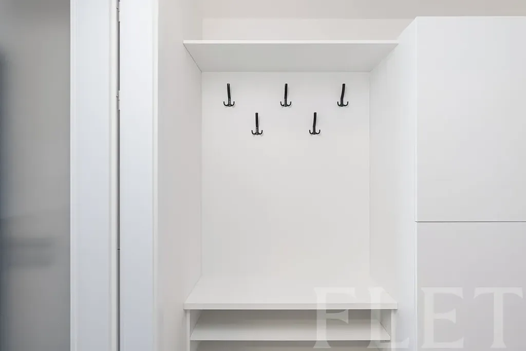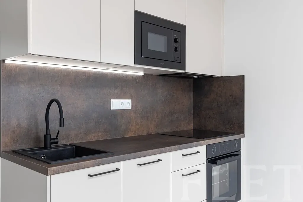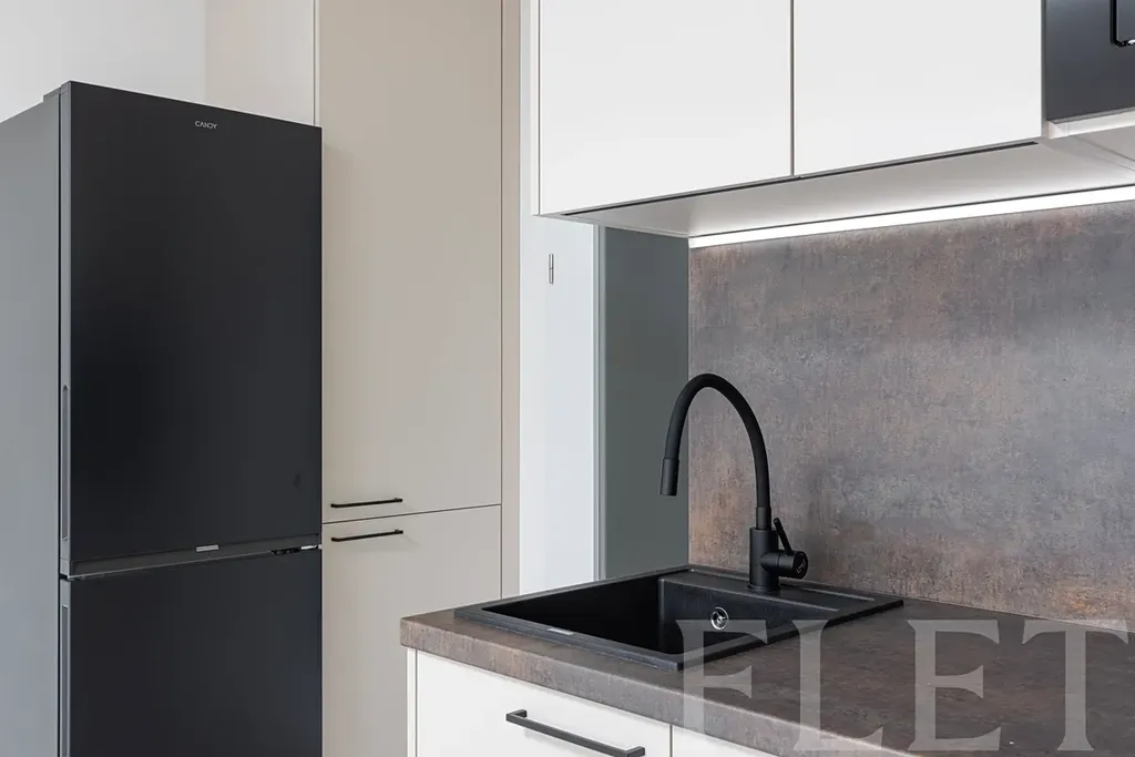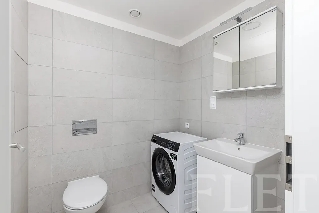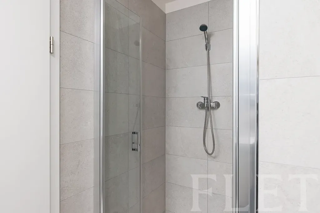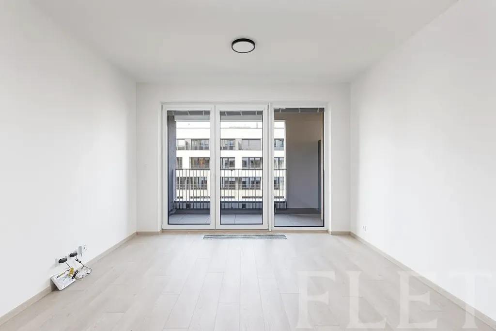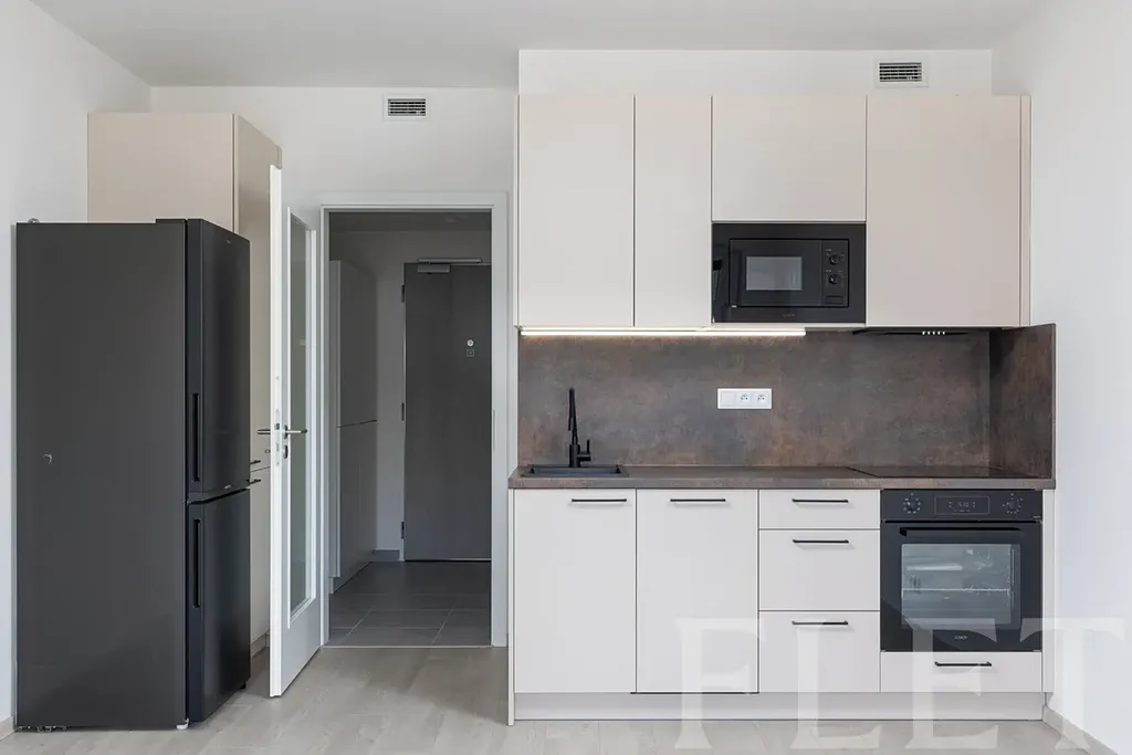 Byt je nevybavený, což vám dává možnost zařídit si jej přesně podle vlastních představ. Součástí kuchyňského koutu jsou základní spotřebiče – indukční varná deska, trouba, mikrovlnná trouba, myčka a lednice s mrazákem. Příjemné vnitřní prostředí zajišťuje rekuperační jednotka, která se stará o pravidelnou výměnu vzduchu.