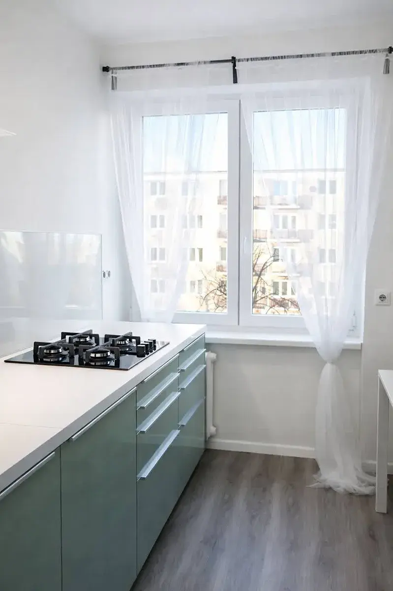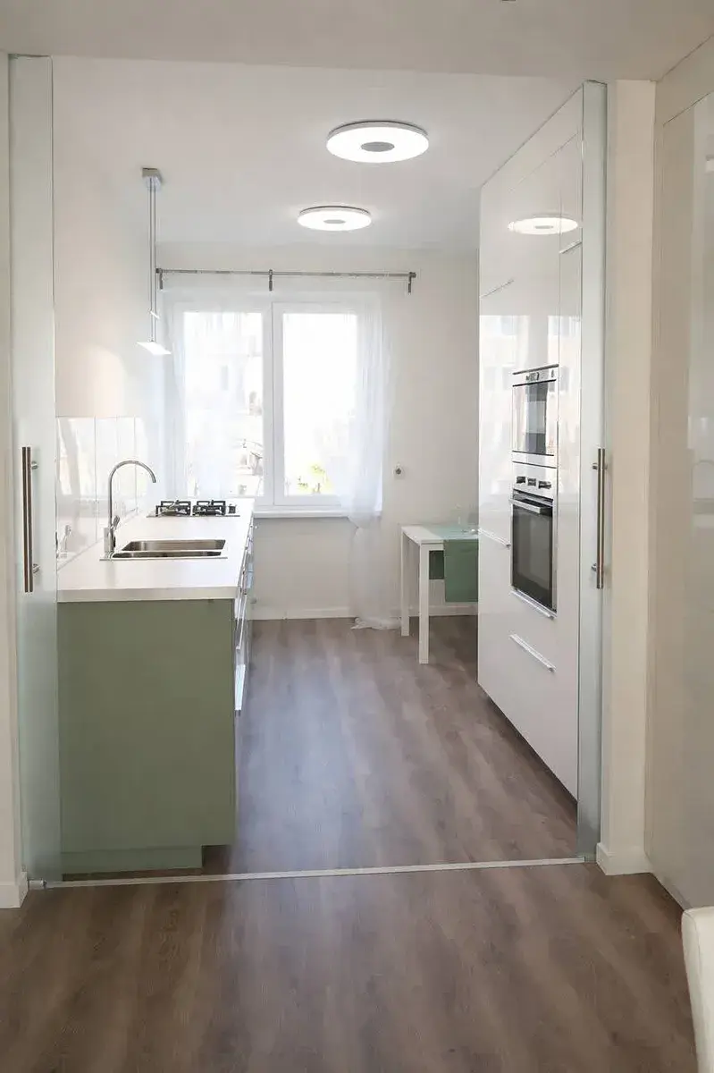 • Obývací pokoj s kuchyňským koutem: Světlý prostor s kuchyňskou linkou, prakticky oddělen posuvnou stěnou z matného skla, která zajišťuje soukromí a flexibilitu využití prostoru.