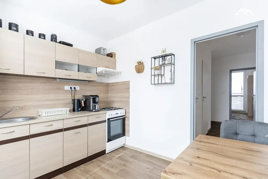 Byt tvoří vstupní chodba, dvě samostatné ložnice, prostorný obývací pokoj vybavený rozkládacím gaučem, stolkem, skříňkou pod televizi, poličkami, kuchyní s kuchyňskou linkou vybavenou sporákem s plynovým vařičem, lednicí, jídelním stolem se židlemi, v koupelně je vana, umyvadlo, pračka na praní, ...