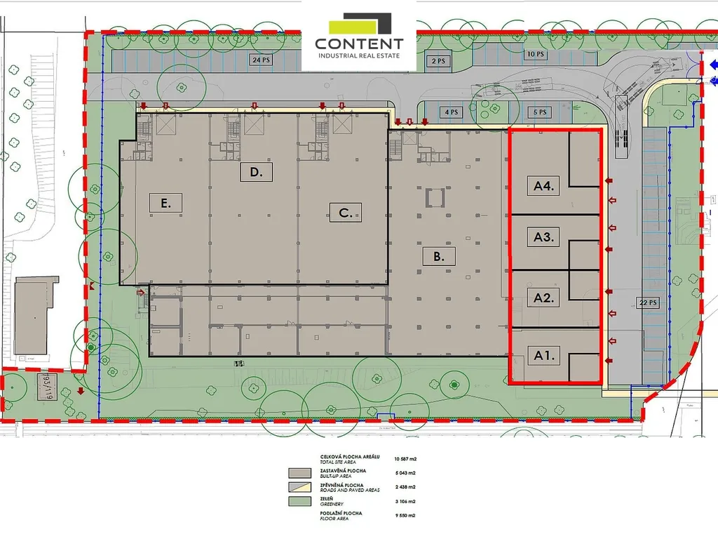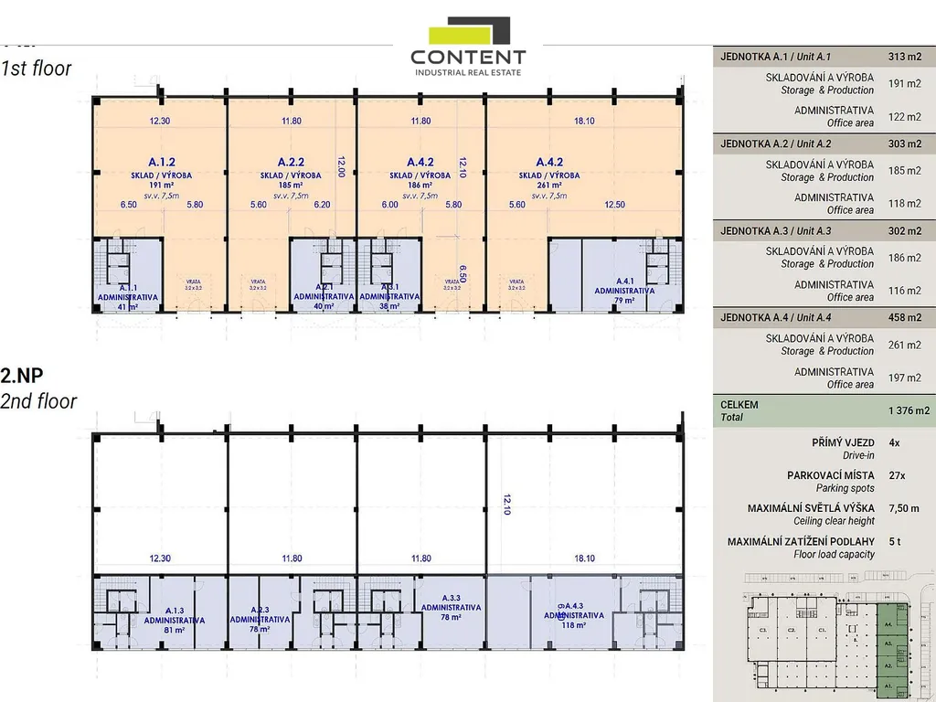 - celková pronajímatelná plocha v jednom celku až 1376 m² (celá budova A)
