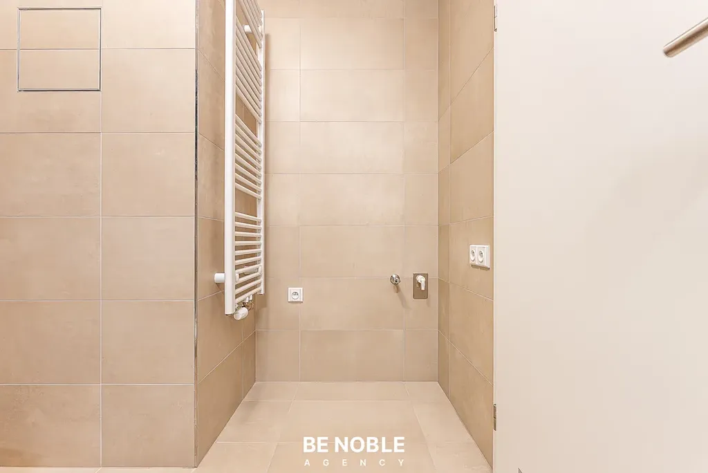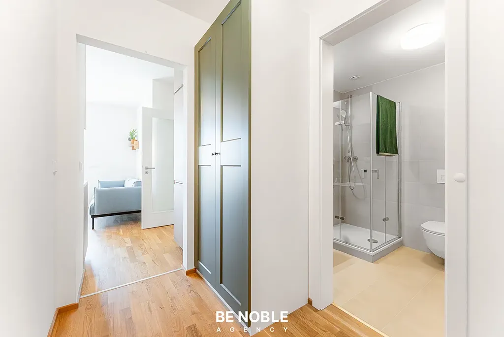 Standard bytu podtrhují dřevěné podlahy, stropy o výšce 2,67 m a elektronicky řízené venkovní žaluzie. Koupelna (4,2 m²) je vybavena sprchovým koutem a připravena na umístění pračky se sušičkou. Byt je zcela nový a připraven k okamžitému nastěhování.