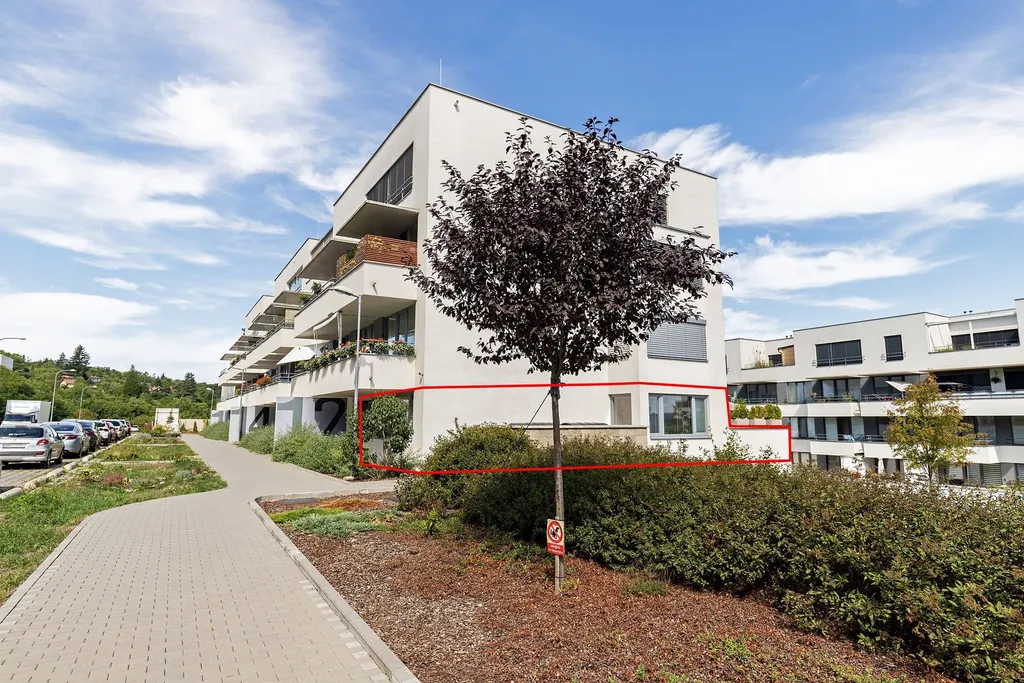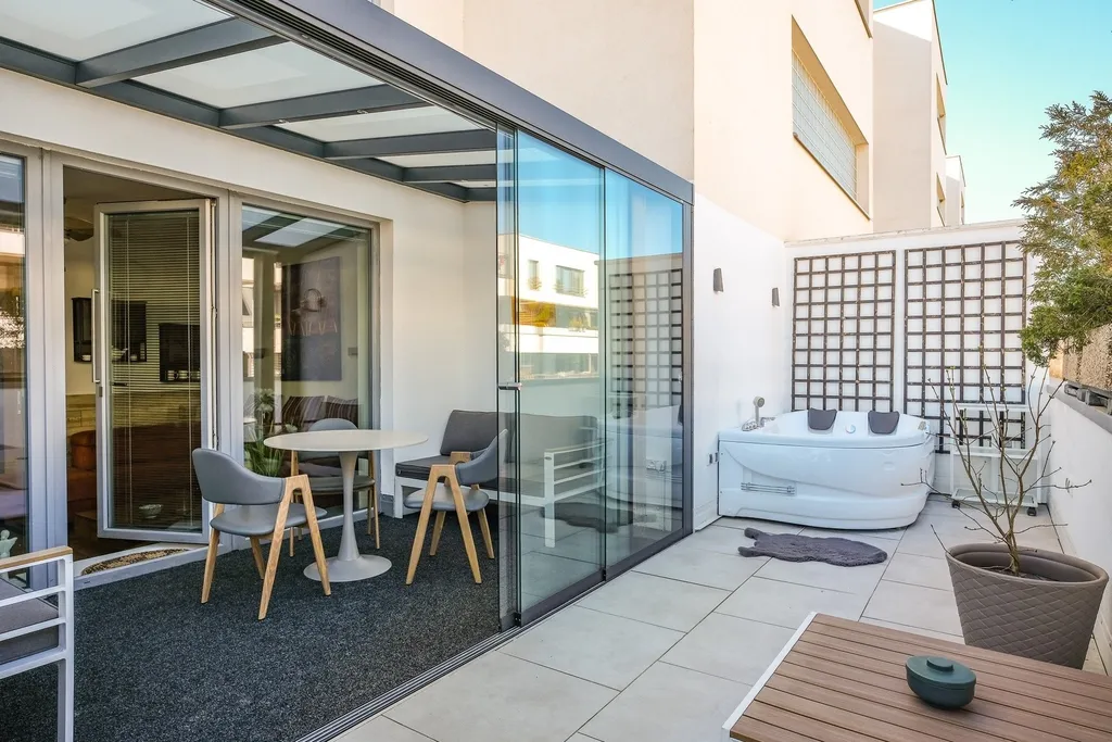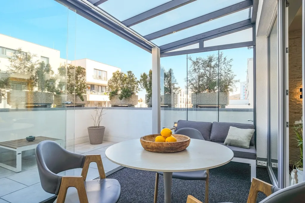 Byt o užitné ploše 63 m² je doplněn o nádhernou zimní zahradu (9 m²) s bezrámovým zasklením, která vám umožní užívat si prostor po celý rok, a navazující terasou o velikosti 15 m² s možností instalace vířivky – ideální místo pro relax po náročném dni.