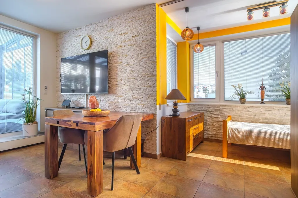 Velkým benefitem je také variabilita dispozice – obývací prostor lze velmi jednoduše upravit tak, aby vznikla oddělená spací část a zároveň zůstala zachována vzdušná kuchyň s jídelnou a přímým vstupem na terasu. Byt tak dokáže nabídnout komfort menšího 3+kk bez nutnosti zásadních stavebních úprav.