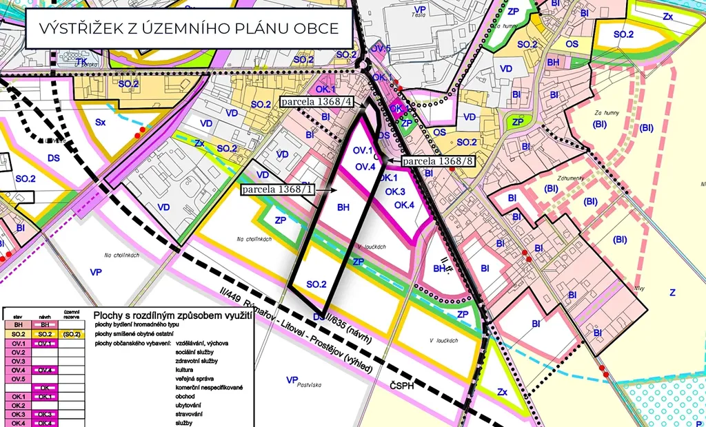 Pro konkrétní umístění parcel v územním plánu obce nahlédněte do fotogalerie. Největší pozemek 1638/1 zasahuje do několika vymezených ploch, které se liší budoucím využitím. Předmětem prodeje je ideální podíl, tedy spoluvlastnictví na každém metru čtverečním na celé ploše zobrazených parcel. Nejedná se o konkrétně vymezené území, na kterém by bylo možné ihned zahájit výstavbu.