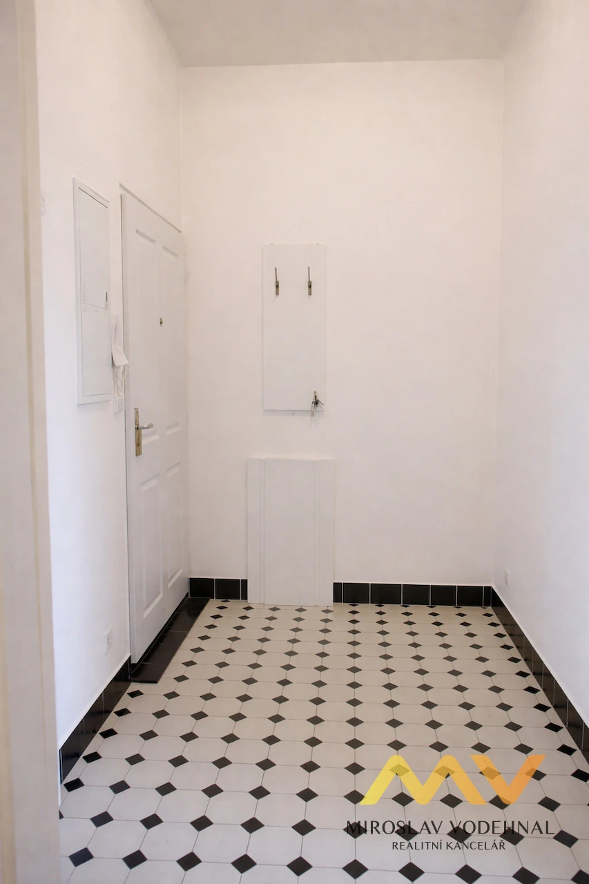 Dispozice bytu tvoří dva samostatné, neprůchozí pokoje o velikosti 19,57 m² a 26,59 m², dále předsíň (4,49 m²) a koupelna se sprchovým koutem a toaletou (4,77 m²). Byt je nezařízený, k dispozici je pouze kuchyňská linka s plynovým sporákem. Podlahy jsou řešeny kombinací parket a dlažby, okna jsou původní dřevěná špaletová. Internetové připojení je možné.