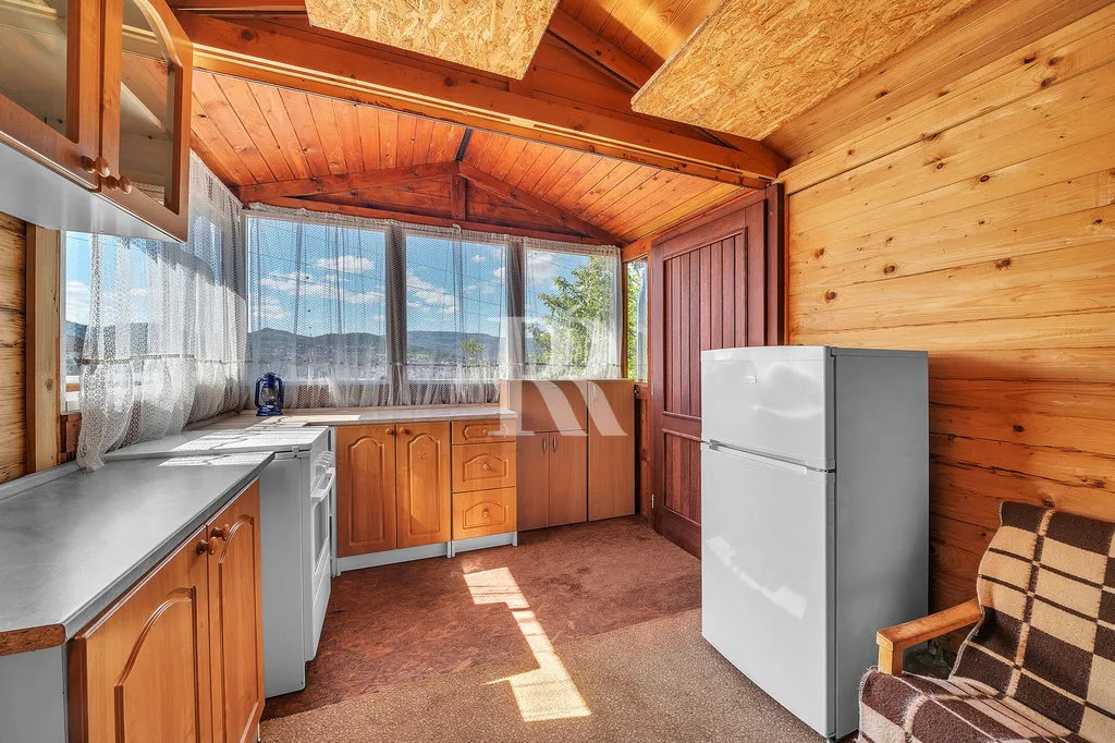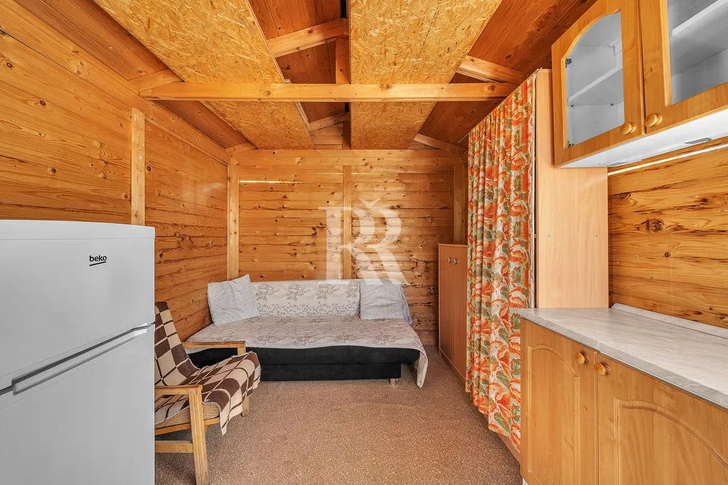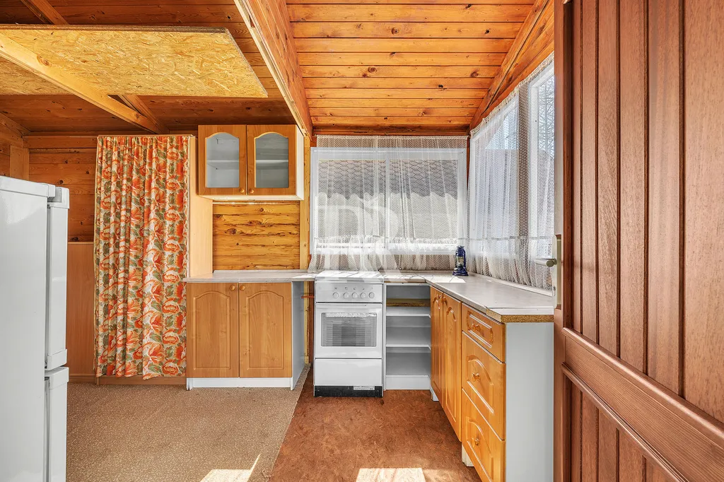 Na zahradě stojí jednoduchá chatka, která je díky velké ploše oken příjemně vzdušná, vybavená je kuchyňskou linkou.