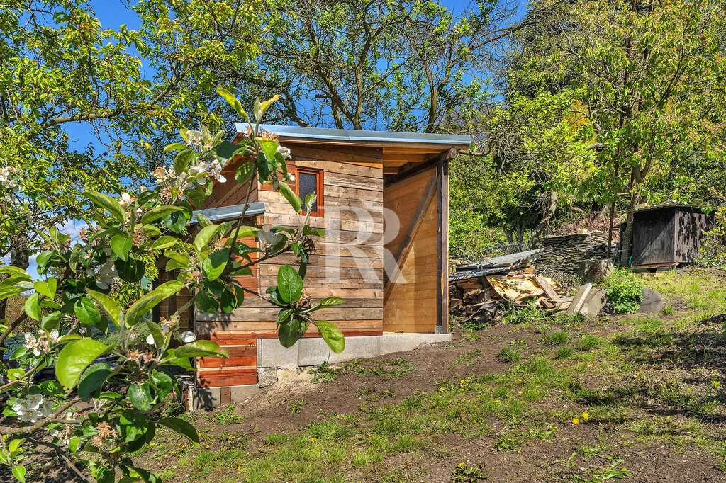 Najdete zde prostor s ohništěm, praktický dřevník kde se dá uskladnit zahradní technika + je zde mnoho zatím nevyužitých zákoutí, která čekají na nového majitele a jeho představy. Ti současní se zde již starají o broskvoně, meruňky, nektarinky, slivoně, jabloně, kanadské borůvky atd..
