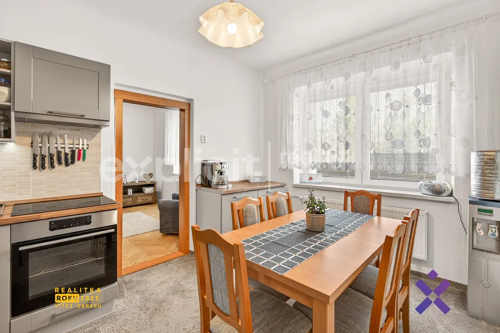 Další místností je kuchyň, která je vybavena kuchyňskou linkou s vestavnou troubou, varnou deskou a myčkou. Na kuchyň plynule navazuje obývací pokoj, čímž vzniká příjemný prostor pro každodenní život i setkávání s rodinou či přáteli. Kuchyňská linka včetně spotřebičů zůstává součástí prodeje, ostatní vybavení domu nebude zahrnuto, což dává novému majiteli možnost upravit si interiér zcela podle vlastních představ.