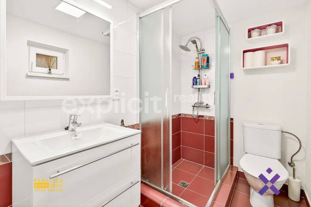 Po levé straně se nachází pokoj, který je ideální jako ložnice nebo dětský pokoj. Vedle tohoto pokoje je koupelna, která je vybavena sprchovým koutem, topným žebříkem a součástí je také WC.