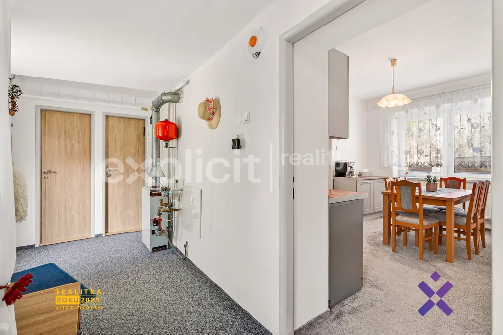 Vedle tohoto pokoje je praktická špajzka vhodná k uskladnění potravin. Hned vedle se nachází vstup do sklepa, který může budoucí majitel využít pro skladování potravin nebo sezónních věcí. Sklep je díky oknu větraný a přirozeně prosvětlený. Dům je zateplen a vybaven plastovými okny s dvojskly, o tepelný komfort se stará plynový kotel (instalace 6/2021), který je umístěn na chodbě.