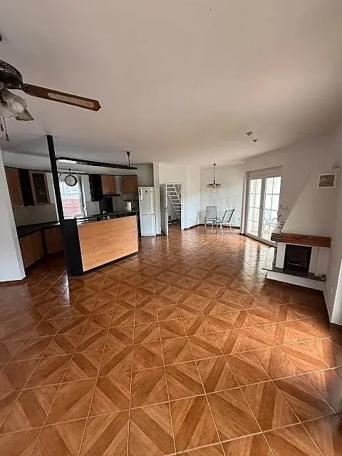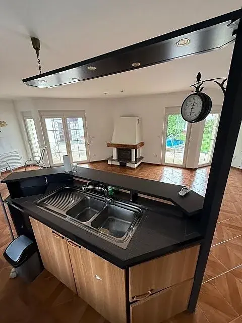 Velice prostorný prosklený slunný obývací pokoj přes 60m2 s kuchyň.linkou s veškerými vest.spotřebiči, s ostrůvkem, s krbovou vložkou na tuhá paliva, s několika vstupy přes francouzké okno na terasu téměř 40m2 s přímým vstupem do bazénu.