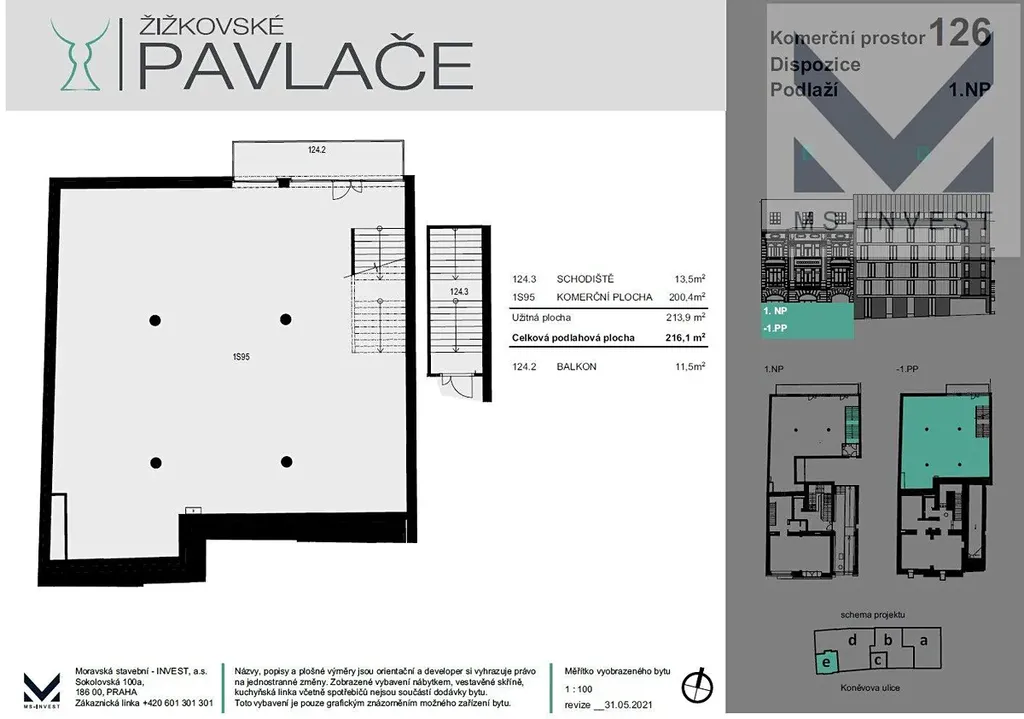 Prodej obchodního prostoru s terasou o výměře 216 + 12 m2 v přízemí novostavby rezidenčního projektu Žižkovské pavlače u parku Vítkov. Terasa je orientována na park Vítkov. Možné využití: kanceláře, obchod, showroom, apod. Provedena stavební příprava pro klimatizaci ( chlazení), vytápění plynovou kotelnou v objektu. Uvedená cena je vč. DPH, cena BEZ DPH je 14 860 000,- Kč., tedy 67 000,-Kč/m2. Sklep/sklad o velikosti 20 m2 je v ceně. Možnost dokoupení garážového stání ve druhém podzemním podlaží komplexu. Prostor se nabízí jako nezkolaudovaná jednotka ve stavu shell and core. Jedná se o poslední dostupnou komerční jednotku v projektu Žižkovské pavlače, kde vzniklo 130 bytových jednotek a 10 komerčních jednotek . Prodej přímo od developera.