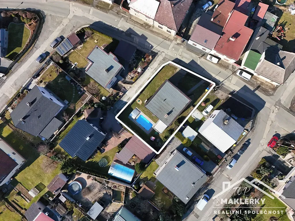 V zadní části u domu je hliníková pergola s otočnými lamelami (jednu stranu lze zastínit stahovací přepážkou) a bazén 3x6m. Střecha rovná, plechová. Do garáže je vstup pouze zvenčí.