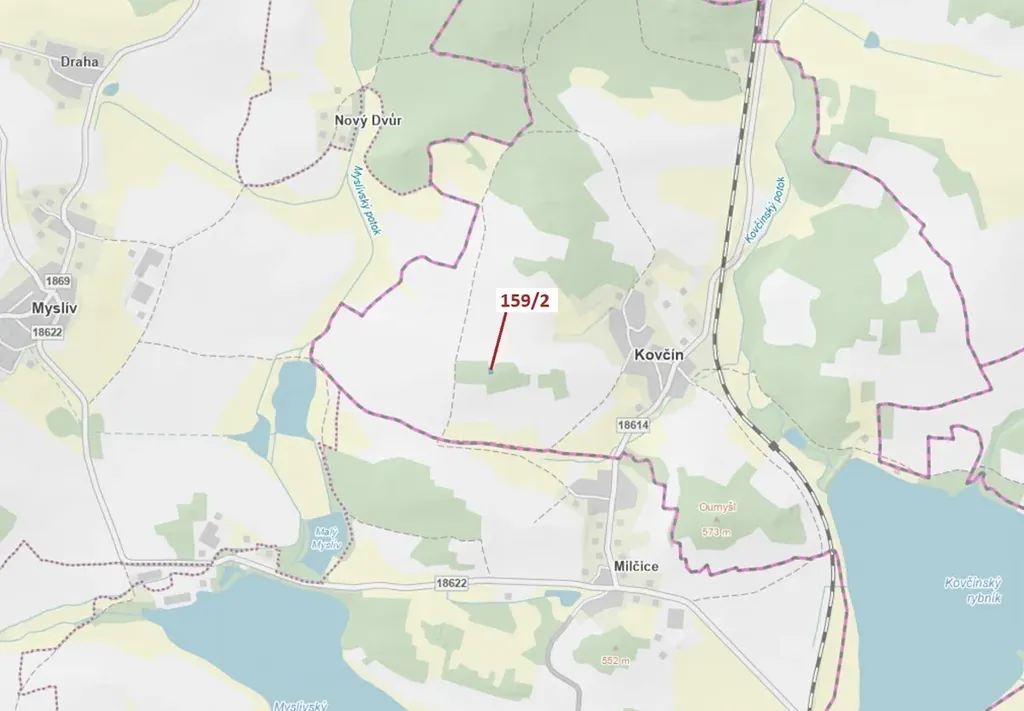 Lesní pozemek o výměře 362 m2, parcelní číslo 159/2, podíl 1/1, katastrální území Kovčín, obec Kovčín, obec s rozšířenou působností Horažďovice, okres Klatovy, Plzeňský kraj. Po těžbě.