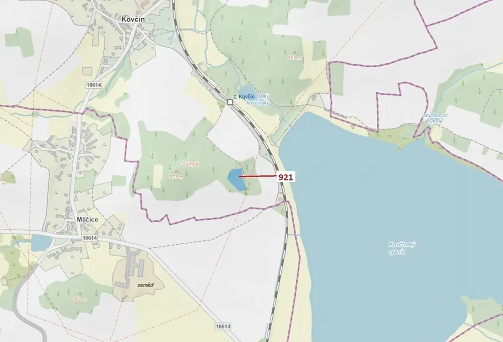 Lesní pozemek o výměře 4401 m2, parcelní číslo 921, podíl 1/1, katastrální území Kovčín, obec Kovčín, obec s rozšířenou působností Horažďovice, okres Klatovy, Plzeňský kraj. Po těžbě.