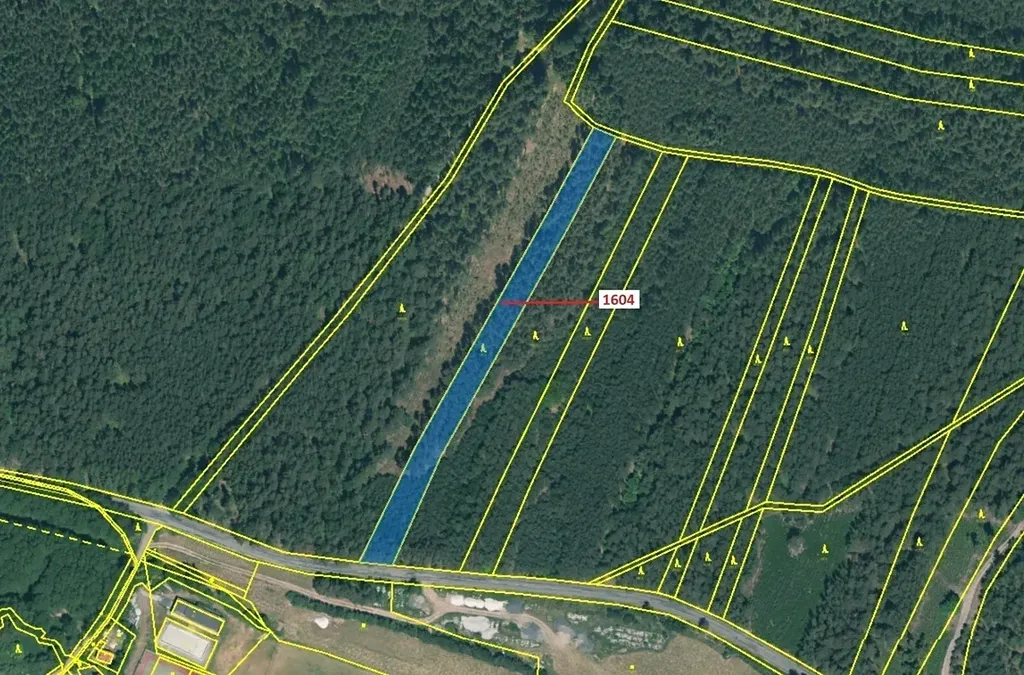 Lesní pozemek o výměře 4076 m2, parcelní číslo 1604, podíl 1/1, katastrální území Podbořánky, obec Jesenice, obec s rozšířenou působností Rakovník, okres Rakovník, Středočeský kraj. Po těžbě.