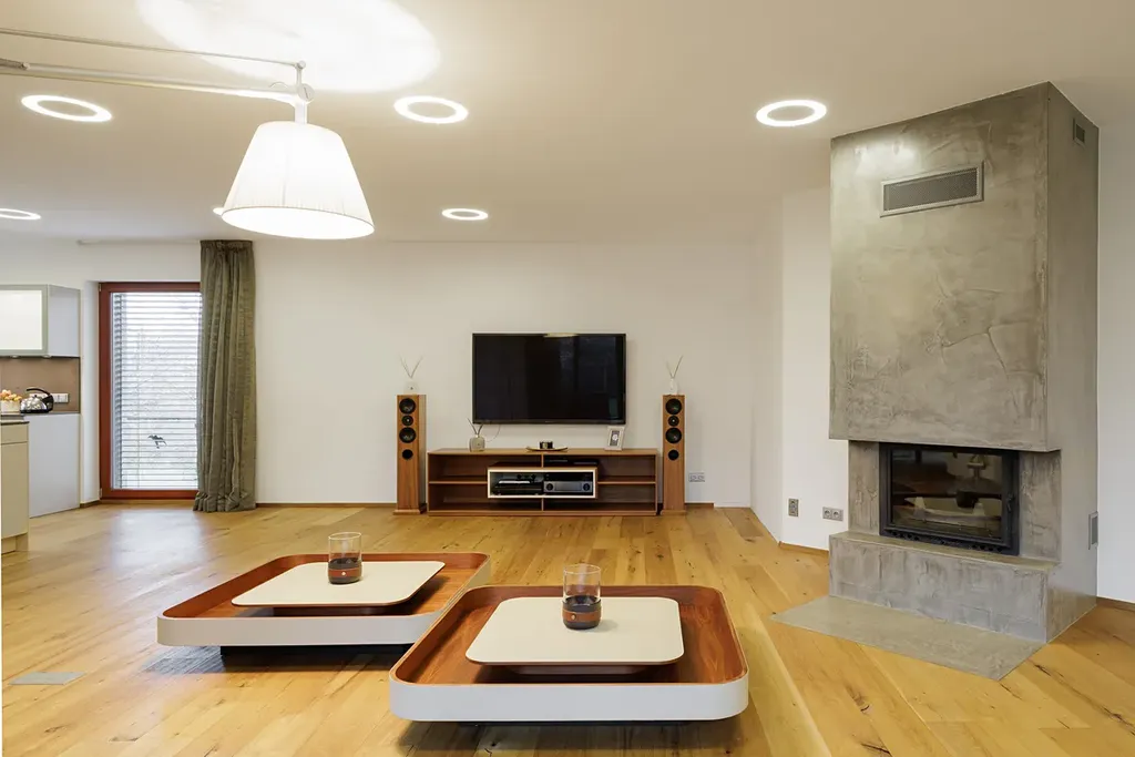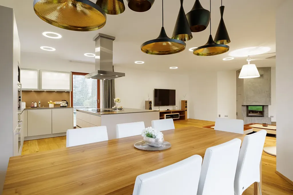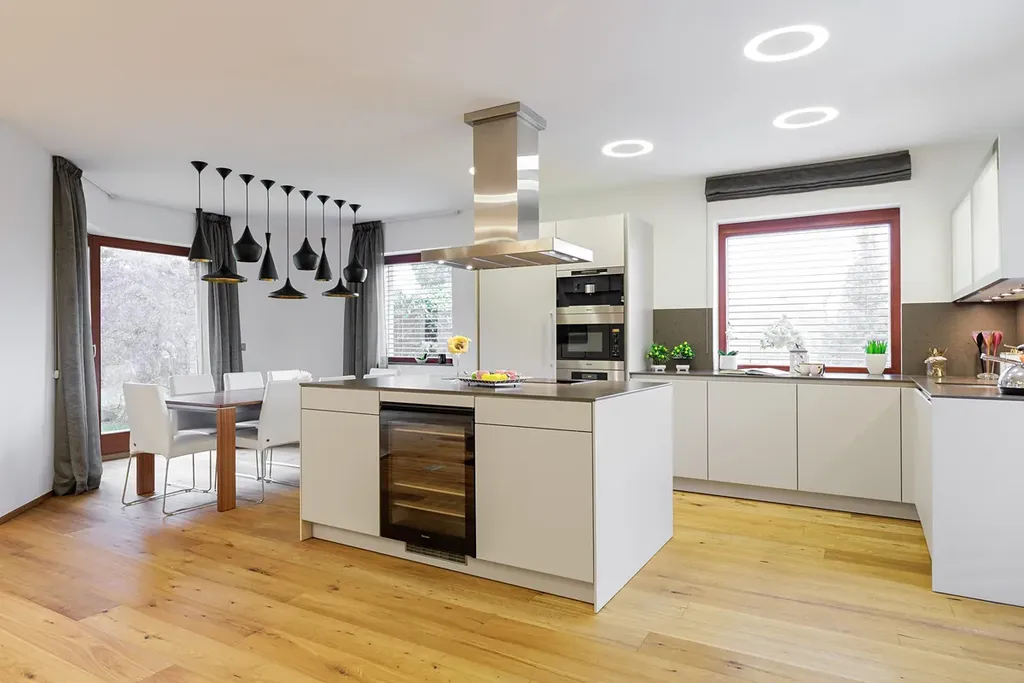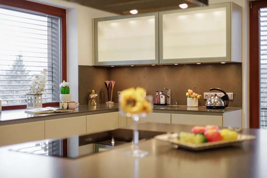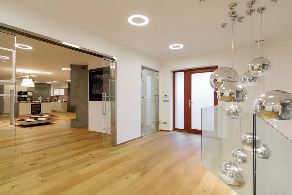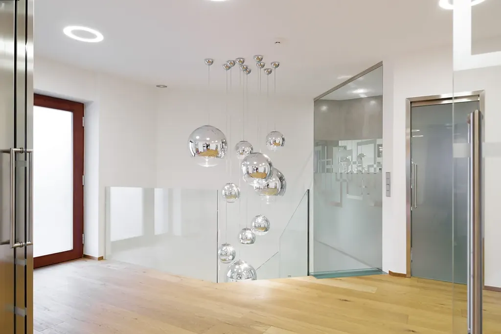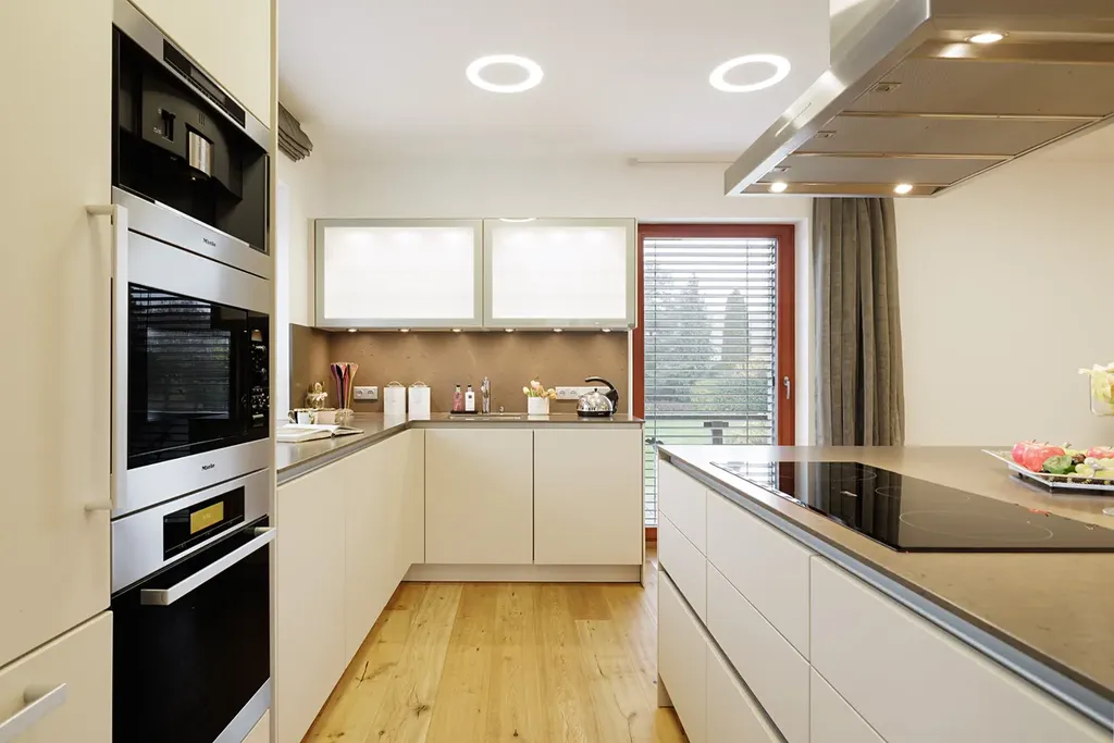 Velká okna od podlahy až ke stropu poskytují nepřerušované výhledy do okolní krajiny a prosvětlují interiér. Na většině oken jsou venkovní žaluzie, které zajišťují ochranu před sluncem a zároveň poskytují soukromí. Podlahy jsou z kvalitního dubového dřeva, obývací pokoj je vybaven krbem a kuchyňské linky jsou vybaveny spotřebiči Miele. Vytápění je zajištěno podlahovým topením, které je rozvedeno prakticky po celém domě, u větších oken je doplněno o podlahové radiátory. Krbová vložka je teplovodní, napojená na tepelnou soustavu, což umožňuje vytápění i pomocí krbu. Dvojgaráž a další parkovací místo na pozemku zajišťují dostatek parkovacích kapacit. Dům je chráněn zabezpečovacím systémem a napojen na PCO (pult centralizované ochrany).