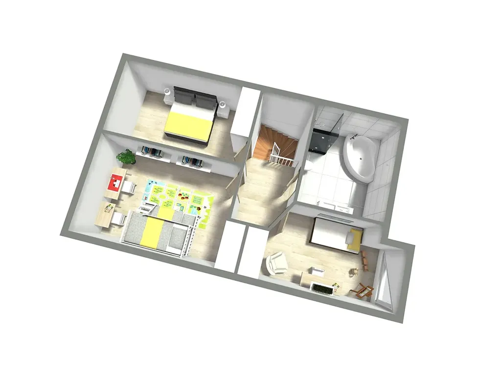 - obývací pokoj s kuchyňským a jídelním koutem s vchodem na terasu, koupelna,