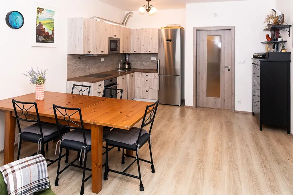 Byt o užitné ploše 65,5m² nabízí prostorný obývací pokoj (26,7 m²) s kuchyňským koutem vybaveným vestavěnými spotřebiči (trouba, varná deska, digestoř, myčka, lednice).