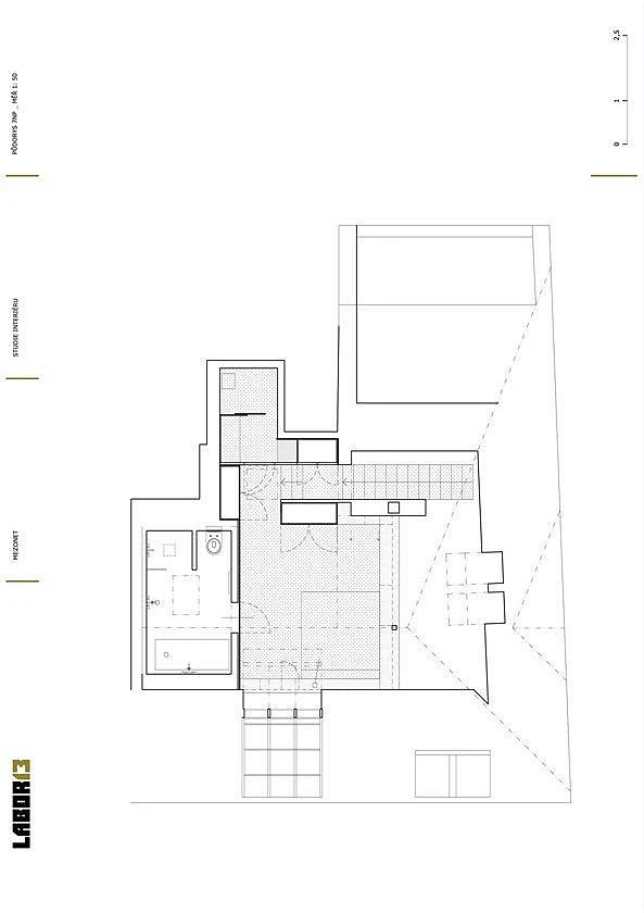 V patře v ložnici pod velkým střešním oknem se opakuje prvek pódia, do kterého je vsazena postel.