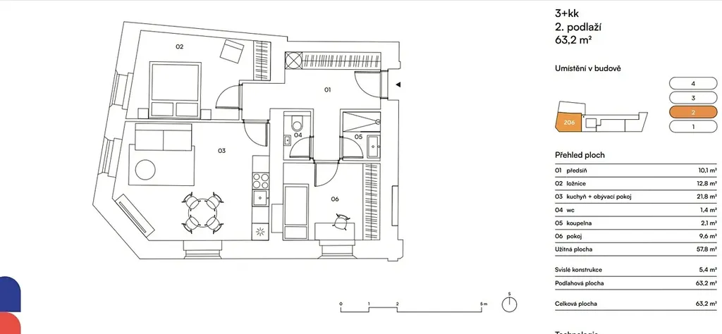 Jednotka je umístněná v přízemí bytové domu a skládá se z: