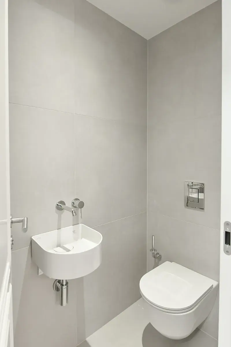 Ke standardu patří kuchyně na míru, kvalitní LVT podlaha s dekorem i vlastnostmi dřeva, velkoformátová dlažba a obklady kombinované s mozaikou v neutrálních zemitých tónech, sanita Laufen a Kartell by Laufen, chromované baterie Grohe Essence včetně podomítkové, vstupní dveře vyrobené truhlářem na zakázku.