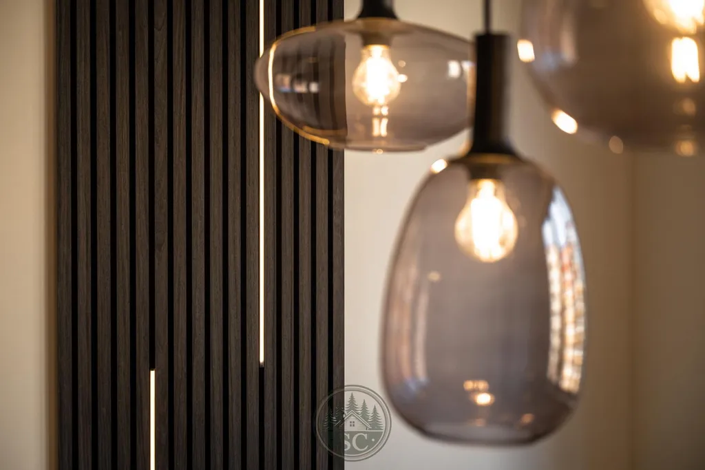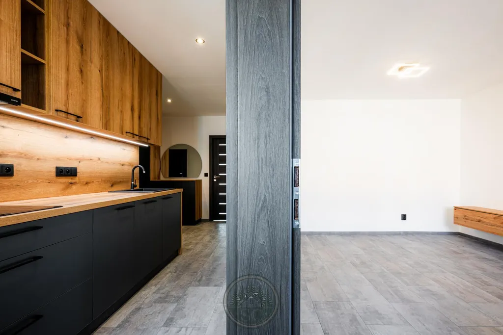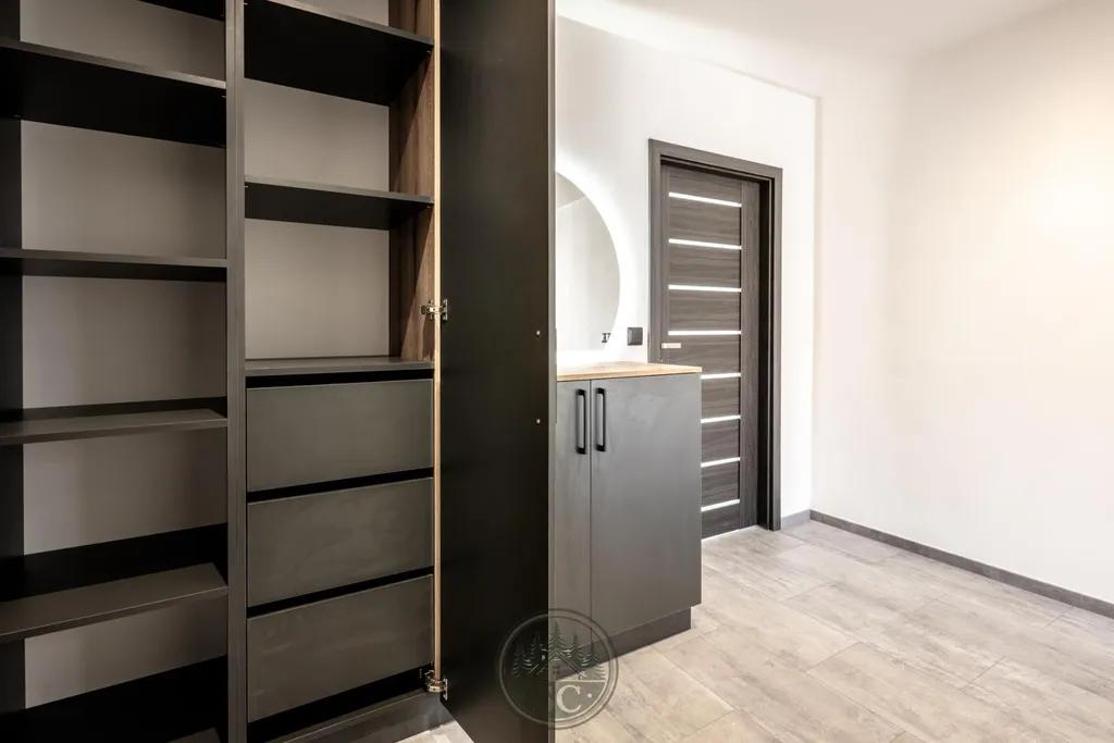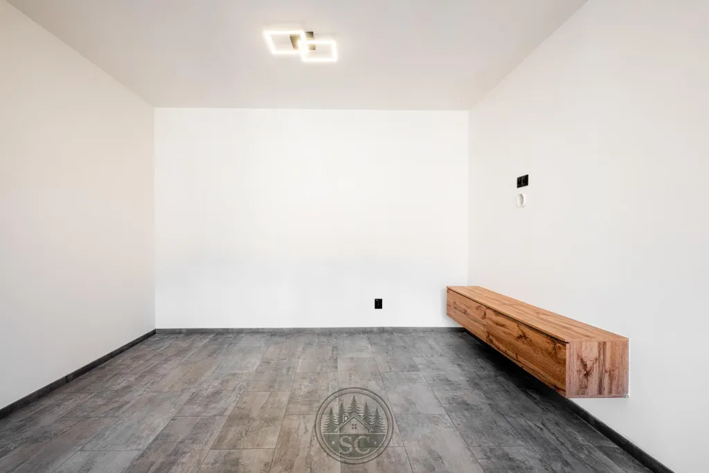 Kuchyňská linka a vestavné skříně na míru od truhláře, masivní jídelní stůl, zabudované spotřebiče, obývací skříňka s přípravou pro TV, nádherná koupelna s podsvícenými nikami samozřejmostí jsou kompletní nové rozvody.